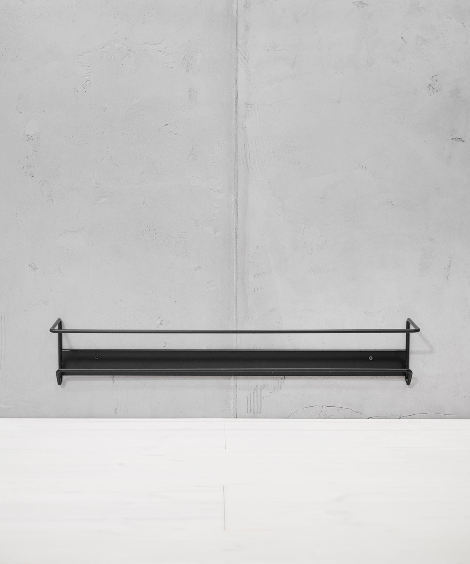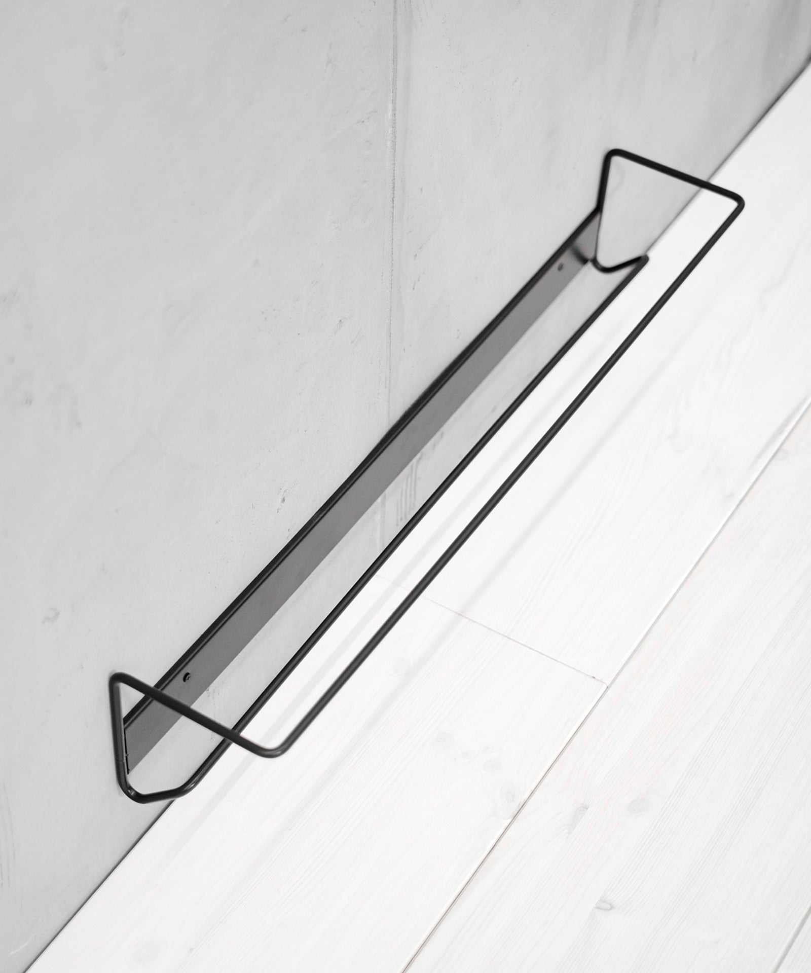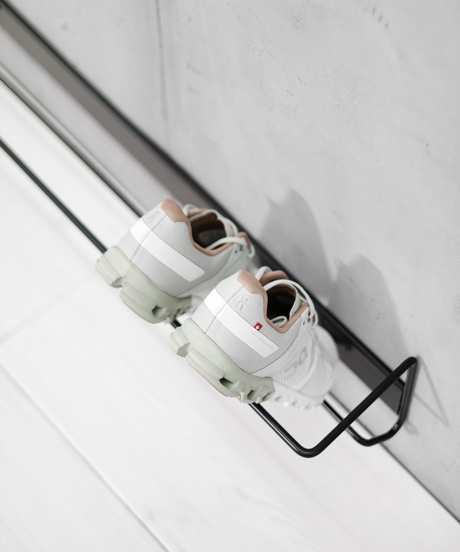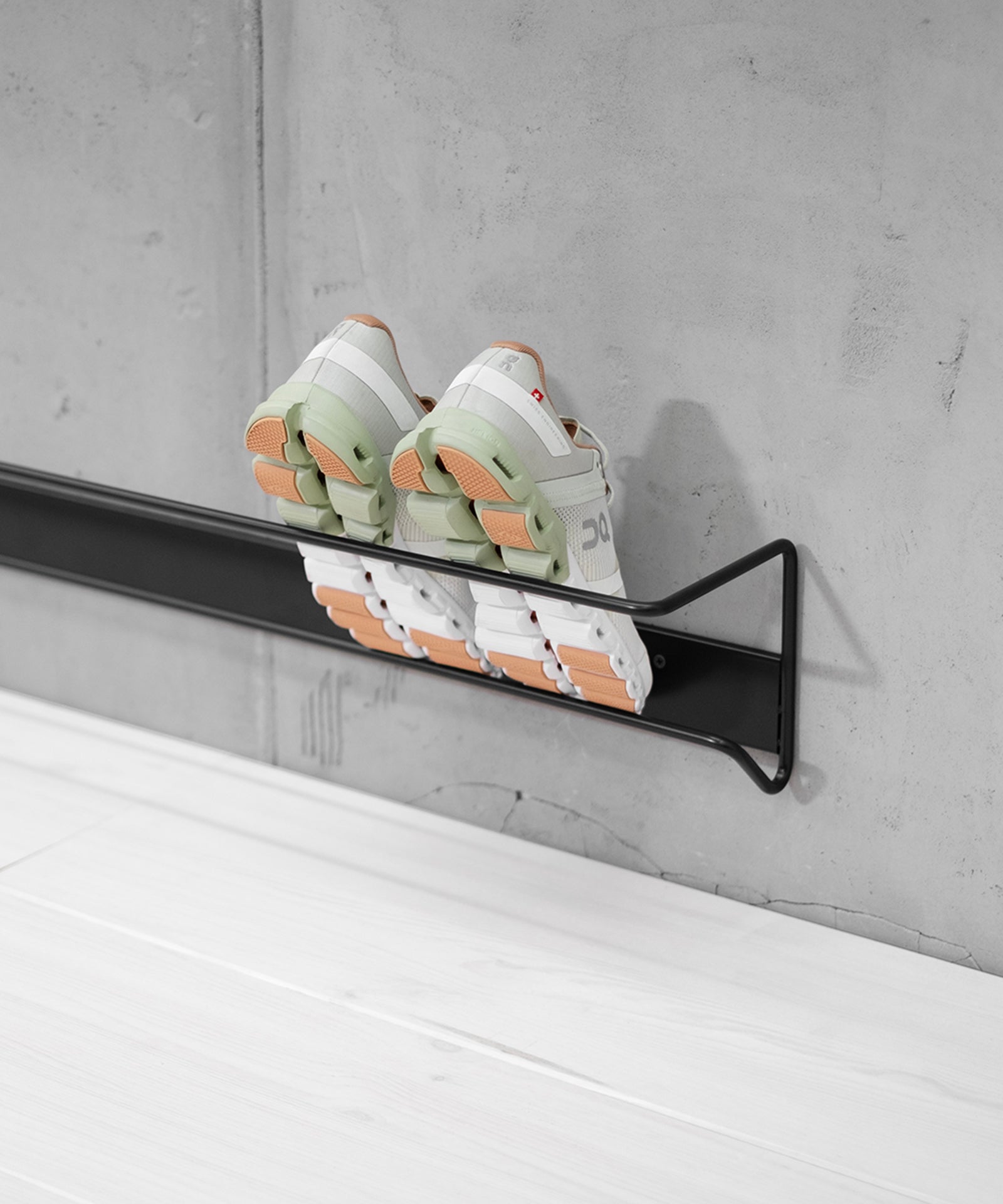 Une ligne continue de fil d'acier de 8 mm suffit à faire flotter les chaussures en toute légèreté. La bande métallique adjacente sert à la fixation et protège le mur de la saleté - tout simplement.