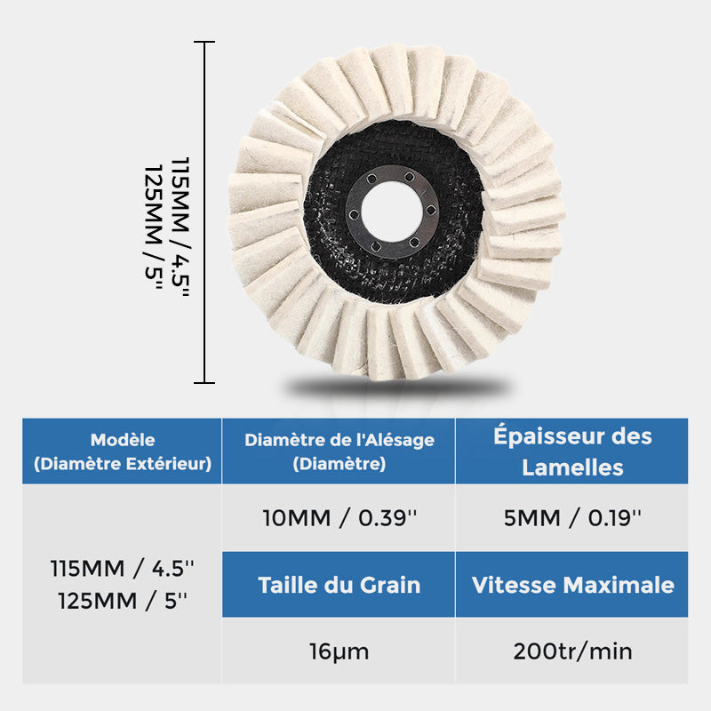 Avec ce disque de polissage en feutre de laine, dites adieu aux finitions approximatives et obtenez un résultat professionnel en quelques passages.